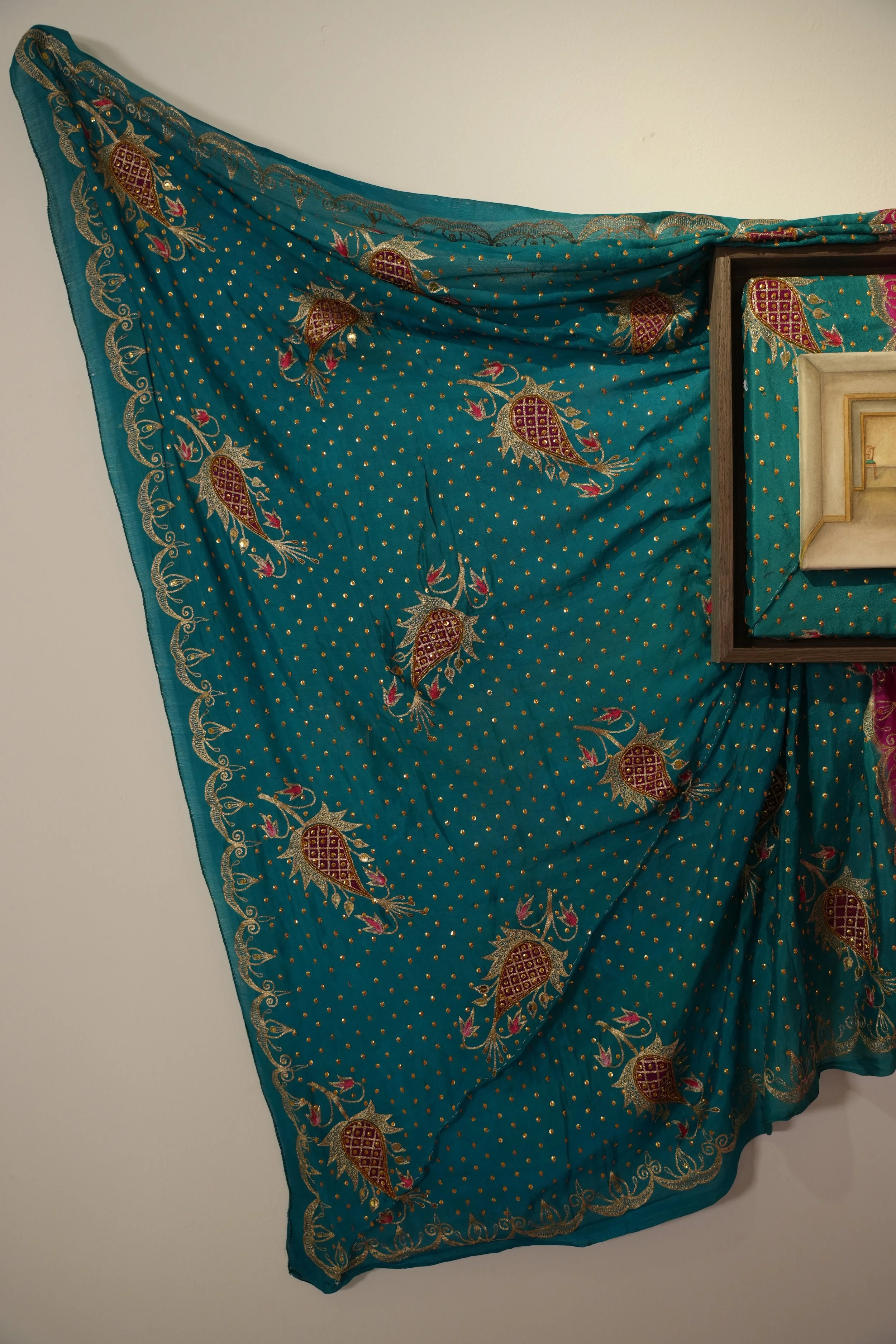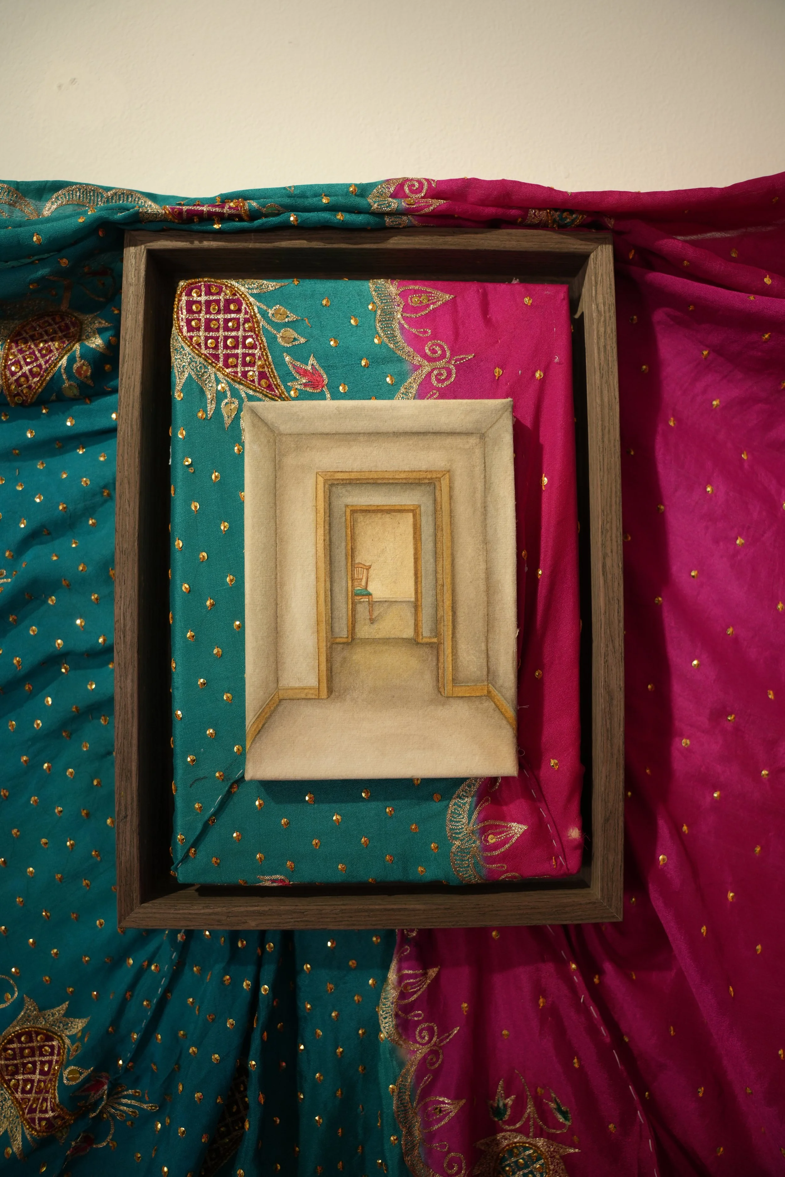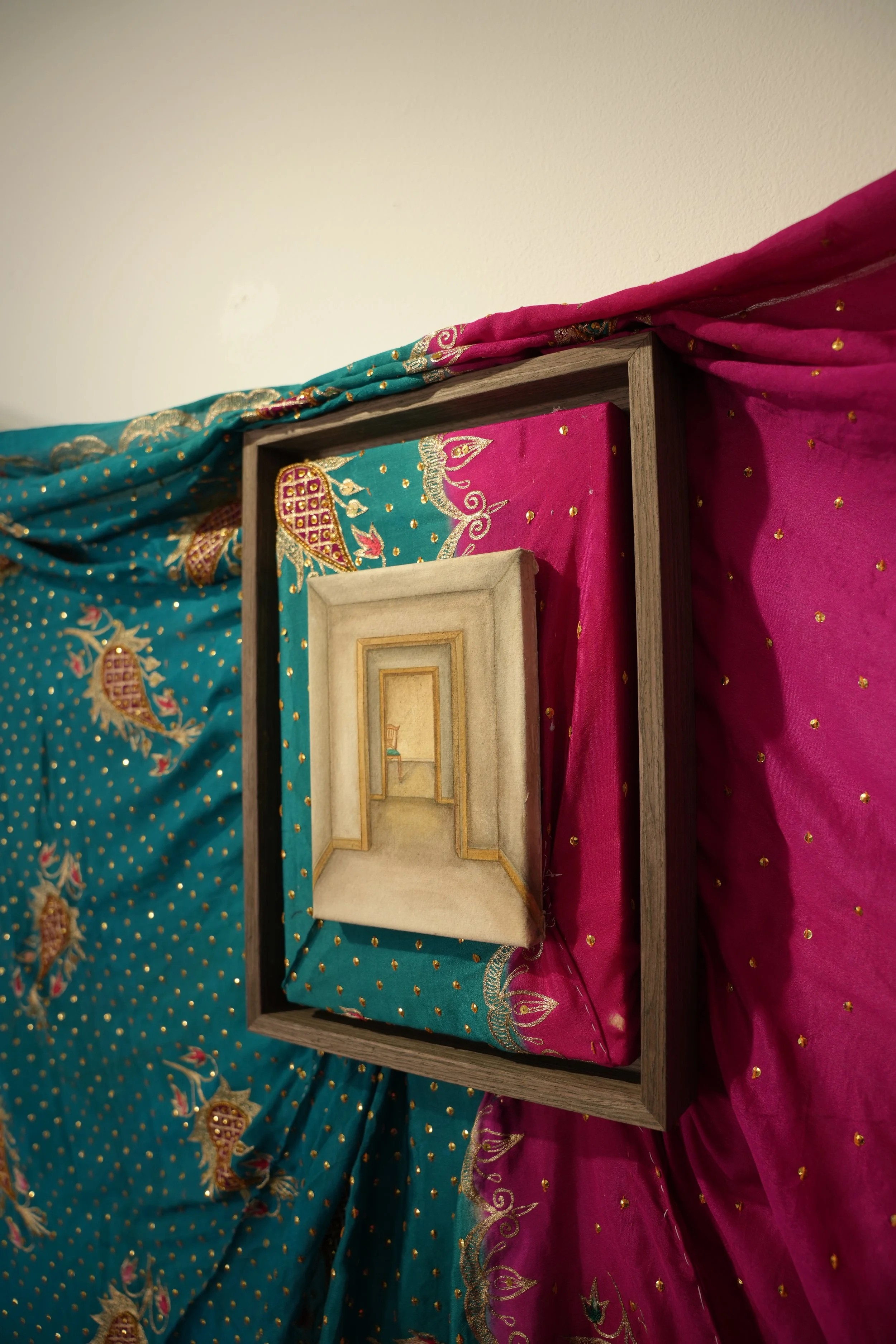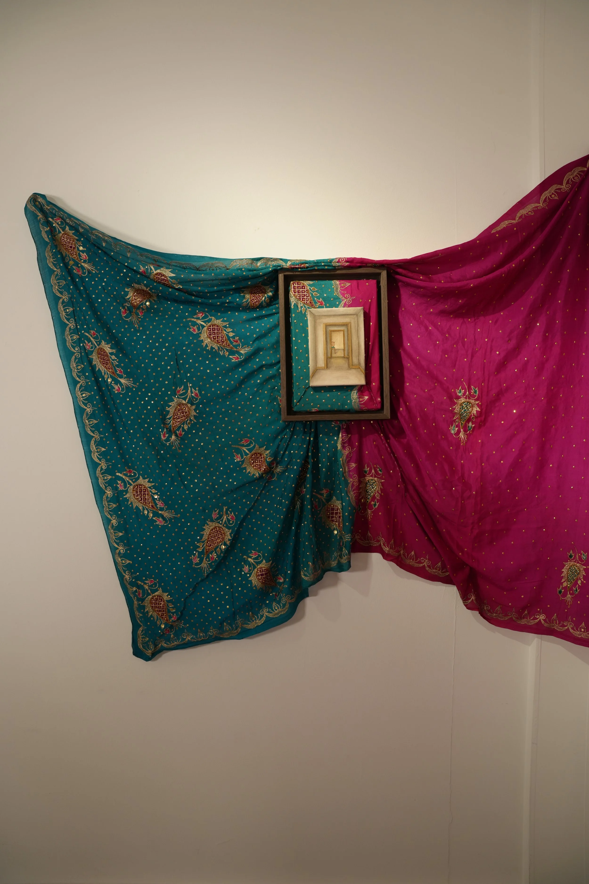 “Saree as Memory Space” grows from this moment, transforming a grandmother’s saree into a vessel of memory and belonging. The silk, woven decades ago and passed through generations, carries with it the scent of home — starch, incense, and clay. When unfolded, it releases a wave of recognition that collapses time and distance, bridging the space between India and Australia.