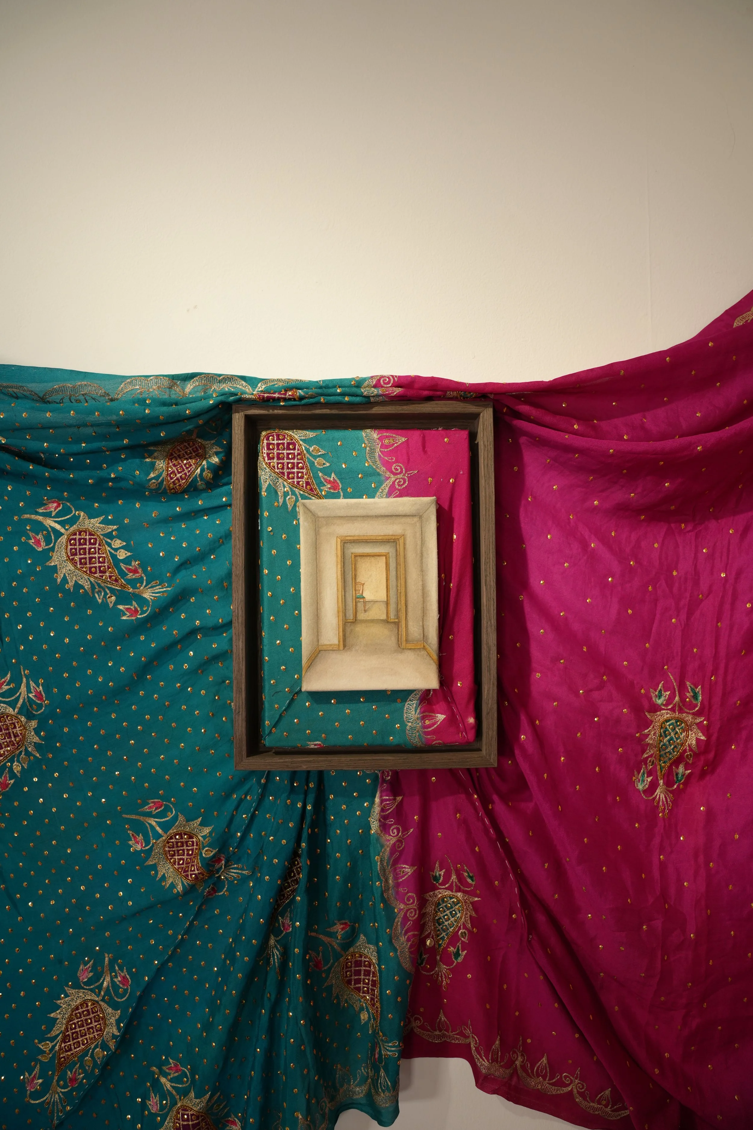 The installation builds an environment of stillness and light. The saree hangs like an architectural skin — translucent, breathing, and responsive to air and touch. Drawings and shadows move across its surface, extending the quiet atmospheres once held in paper into real space. Within this soft structure, memory becomes spatial: light filters through the threads, revealing how intimacy can dwell within material.